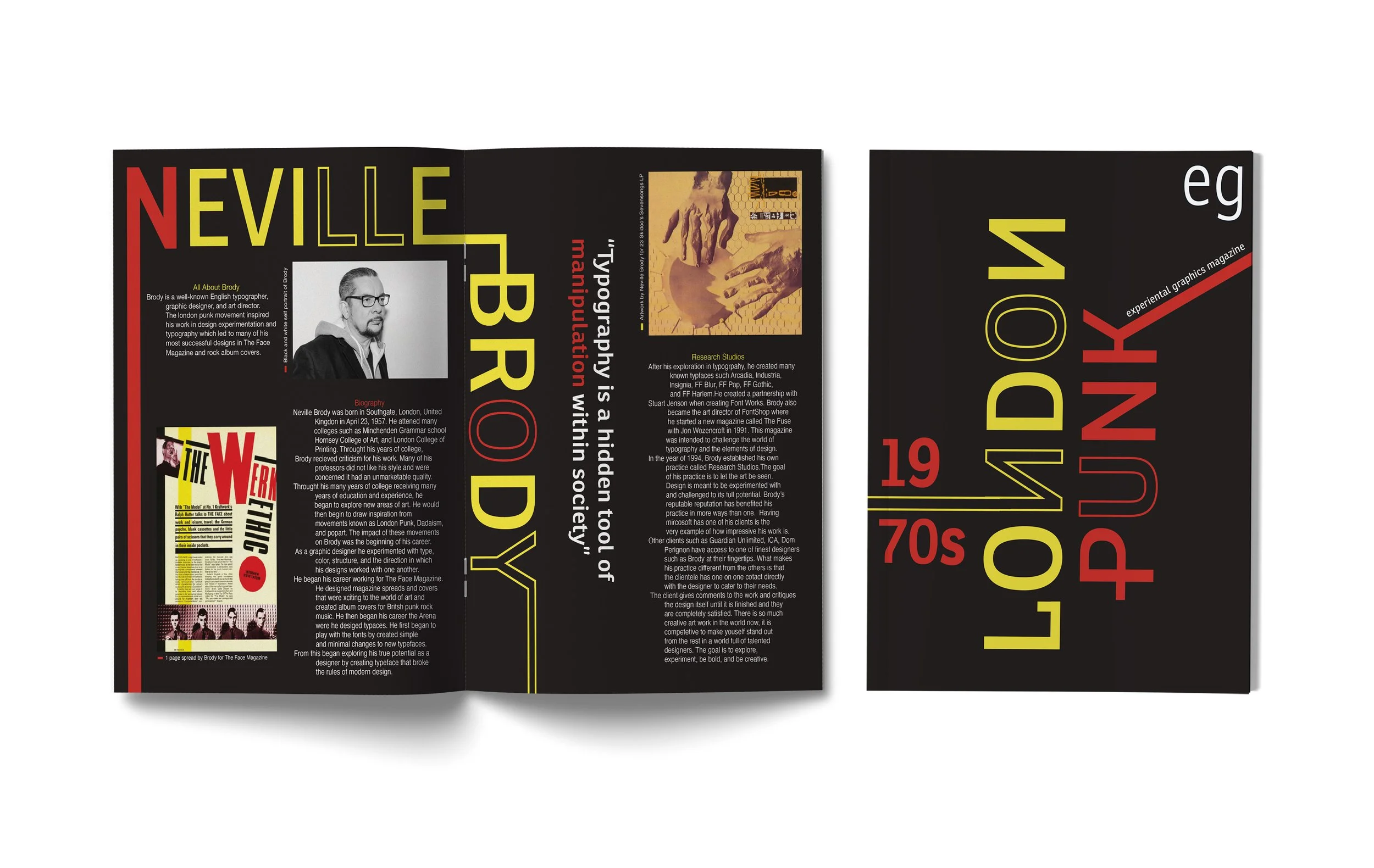 The objective was to create a cover and a magazine spread inspired by a well-known typographer. I chose Neville Brody as my type guru and researched his past work. Using a strong color scheme combination of red and yellow that he uses throughout his work, I tried to think in the mind of the designer to create my very own two-page spread.